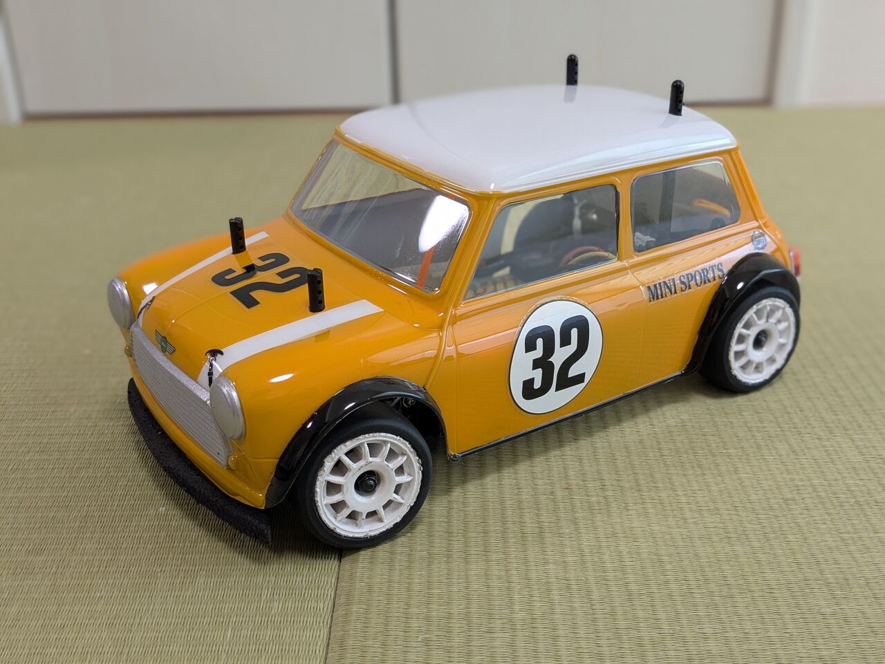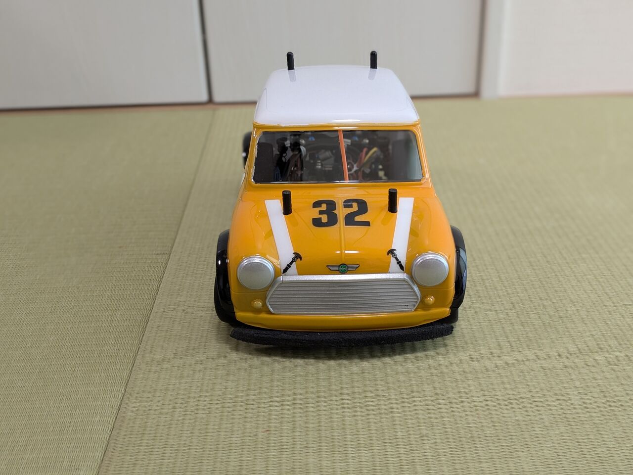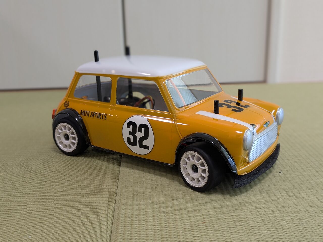 手持ちのミニクーパーボディで試運転したけど,やっぱり少しピーキー…でもスピード出さないなら全然いける.楽しい一台ができた.