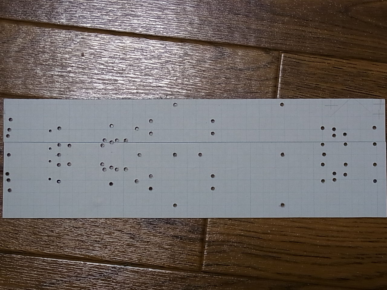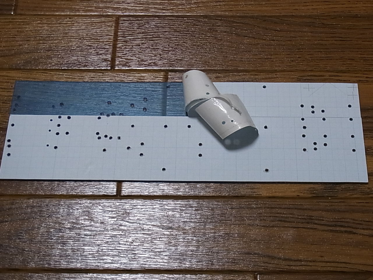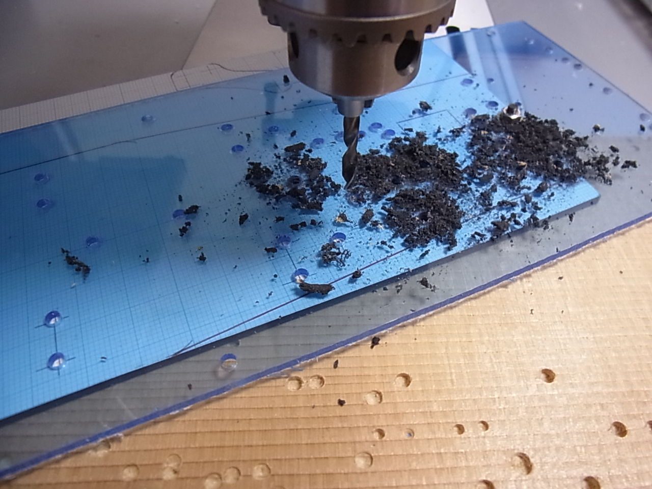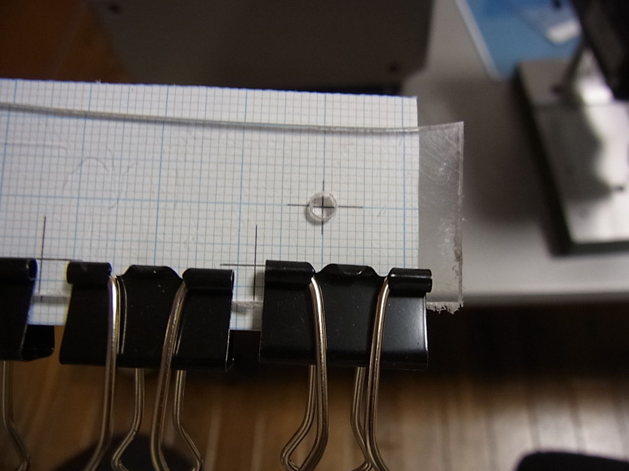 カーボン板に施す穴あけ加工の下穴となる型を,ポリカ板で作成する.具体的にはポリカ板に方眼紙を貼り付け,図面に従って穴あけ位置を罫書き,穴あけをする.