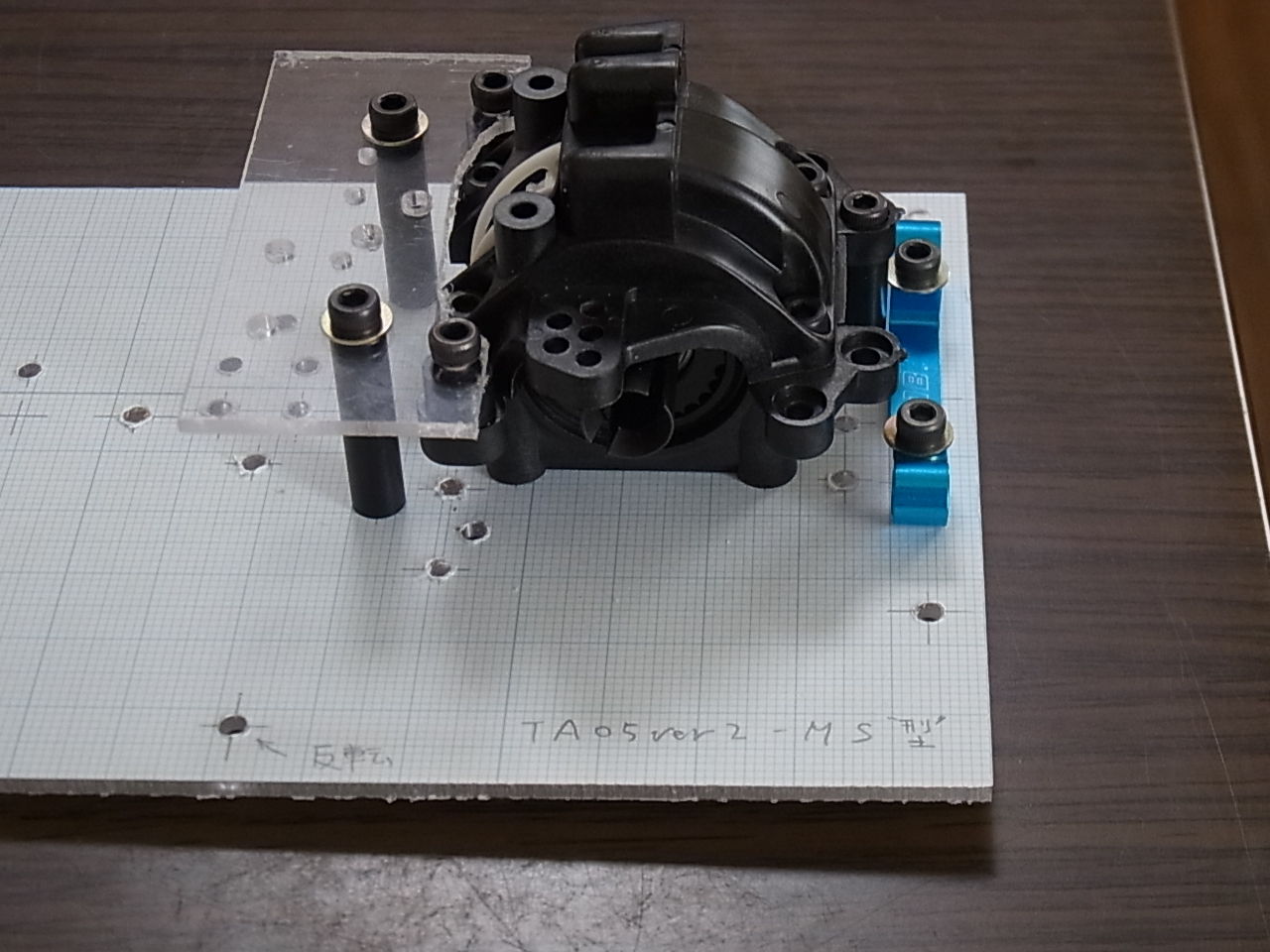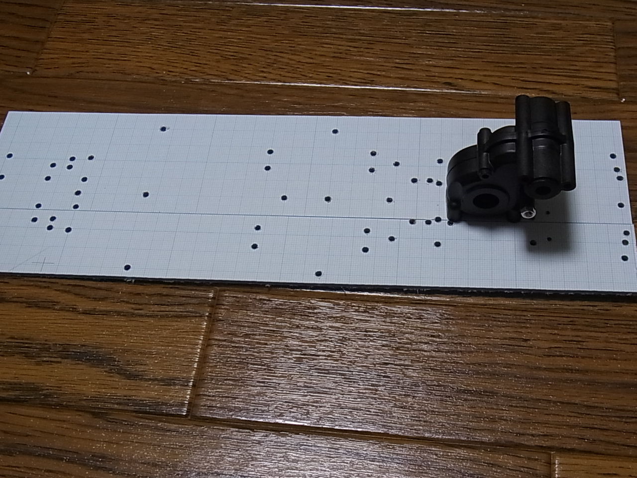 型が出来たら,部品の固定が可能な精度かを確認する.4WD車の場合,プーリーマウント,サスマウント,ギヤケースが取り付けられるかとなる.とくにプーリーマウントはアッパーデッキ取り付け台を兼ねるため,アッパーデッキにあける穴とプーリーマウントのねじ穴の位置の精度が出ているか,ポリカの捨て板で確認した.