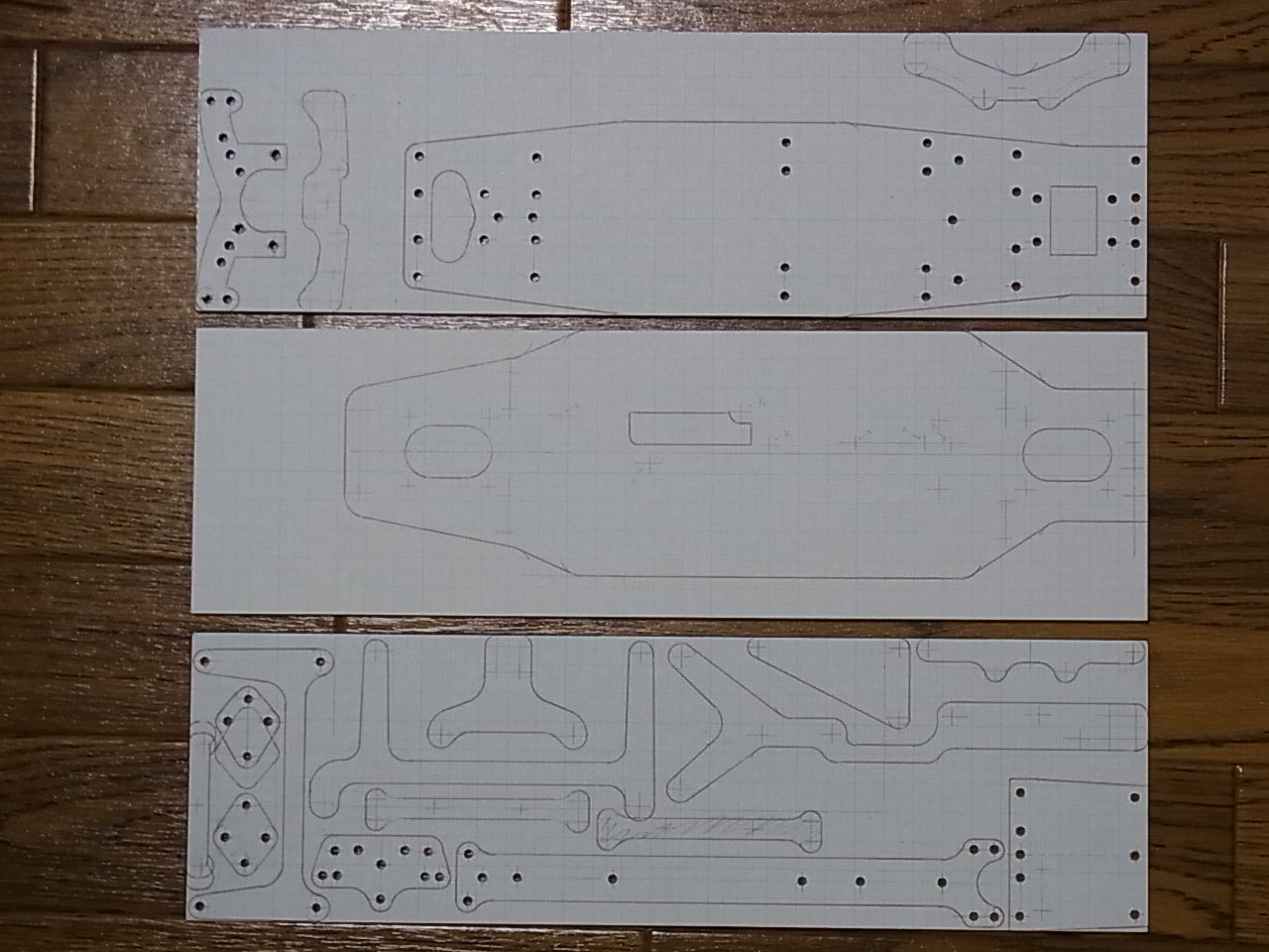 型の製作に成功したら,カーボン板に全部品を罫書く.今回は厚さ2.5mm板を2枚,厚さ2mm板を1枚用意して,FF車と4WD車の部品をすべて罫書いた.内容はメインシャーシ,アッパーデッキ,ダンパーステー,バッテリーホルダーである.