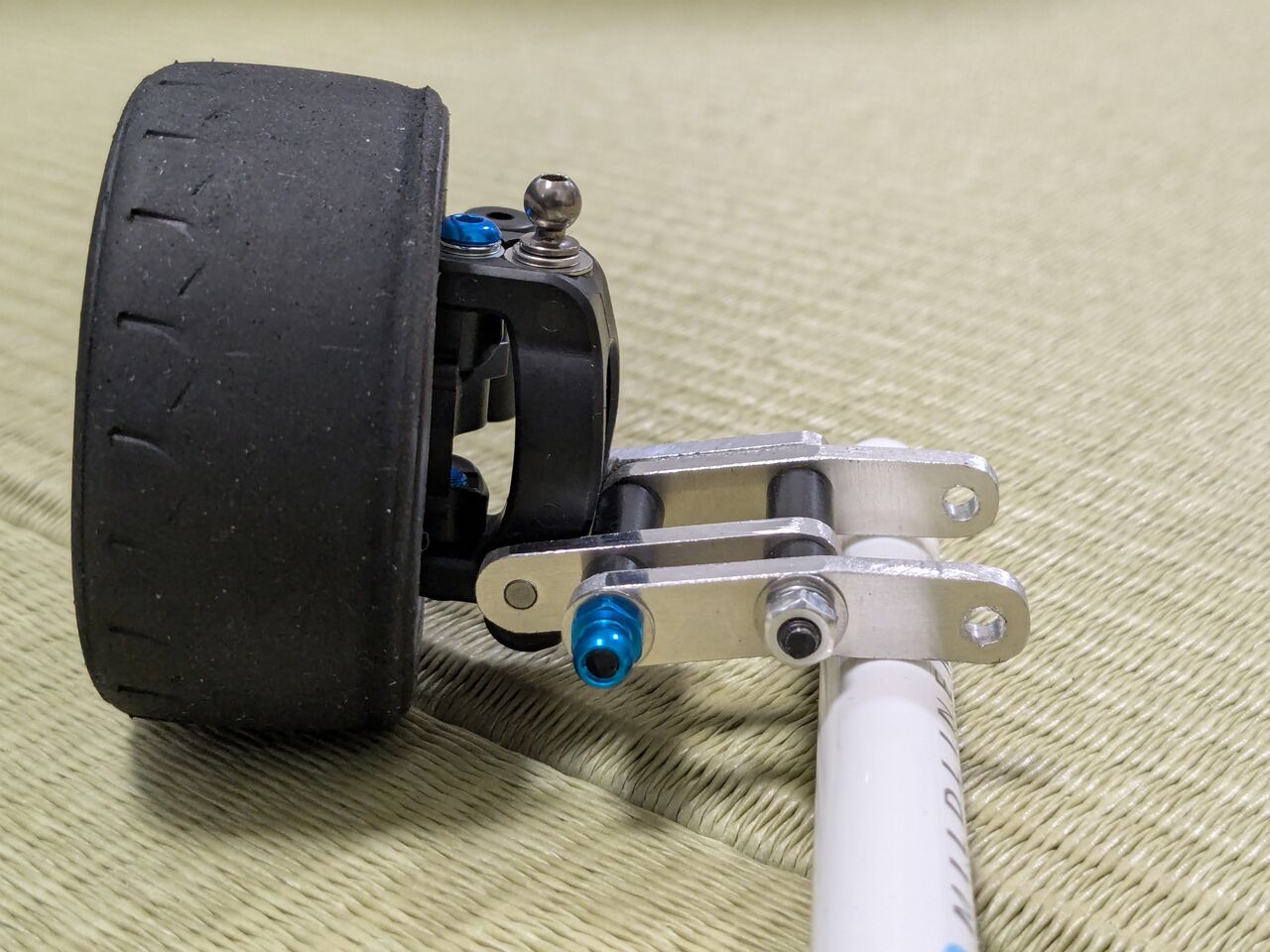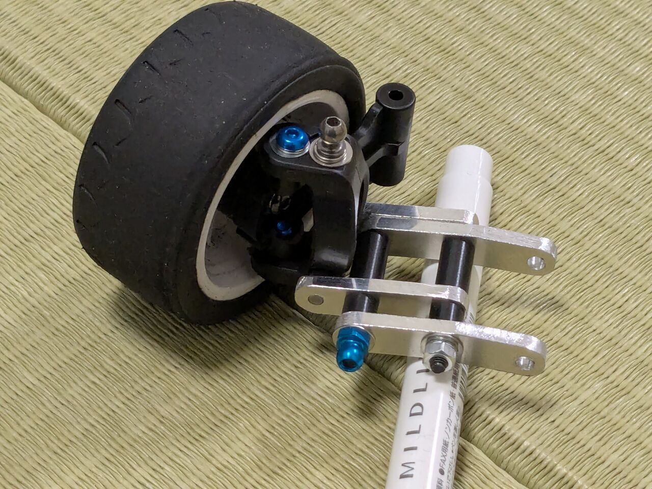 タイヤを装着してみるとこんな感じ.ステアを切ったときに変な干渉とかは…大丈夫そう.